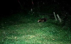 I quietly walked up the floor of the valley, watching the skyline above me and listening for badger sounds. When I came to a barbed wire fence across the valley, I examined the bottom strand closely for badger hairs, and looked for signs of a regular path up the wood, but there were neither.