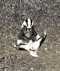 Two more badgers then emerged from the same hole and joined the other two in a very playful mood. All four badgers spent about five minutes chasing each other, biting each others tails and indulging in mock mating, while I watched through binoculars from the other side of the valley in the deepening dusk. It became more difficult to follow what was going on in the darkness, and when three of them disappeared, I could not tell whether they had gone back into the sett or had cleared off hunting. The fourth, who I felt sure was the suckling female, stood on the mound outside the main hole, listening intently, and I hoped that I might be about to see her cubs. However, she went back down the hole and did not reappear.