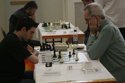 In Round 9, I defeated Alexandra Wilson, putting me on 50%, giving me a chance of achieving my target of 5/10. However, I had mixed feelings on finding that my last round opponent was to be GM Viesturs Meijers - disappointment that I was unlikely to make my target, but delight that I had the chance of playing a GM. No mixed feelings about the result, though - my opponent was obviously suffering from Last Round Blues, and I achieved a life time's ambition - victory over a GM!