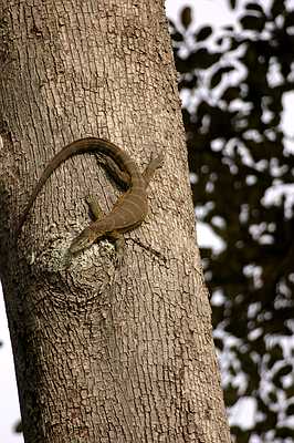Early morning, out on the river in a canoe - a monitor lizard basks in the sunshine, high up in a tree